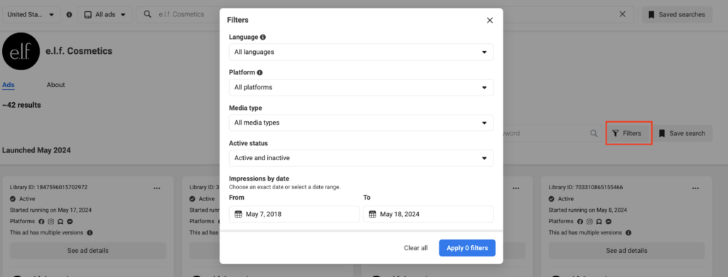You can filter ads by language, platform (Facebook, Instagram, Audience Network, Messenger), media type (images, videos, memes), active status (active or inactive), and impressions by date.