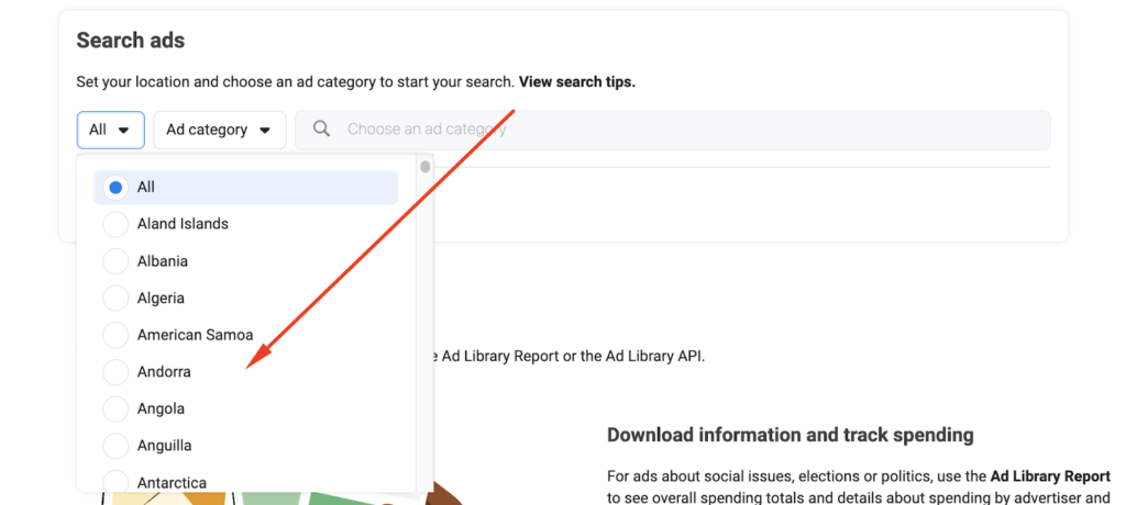- Click on the country selector drop-down menu. You can either choose your current location or search for a specific country (or choose ‘All’). This allows you to see ads specific to that region.