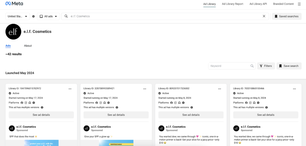 - Click on the advertiser’s name from the search results to see all their active and inactive ads. Each ad will have details like the ad ID, status, platforms, and start date.