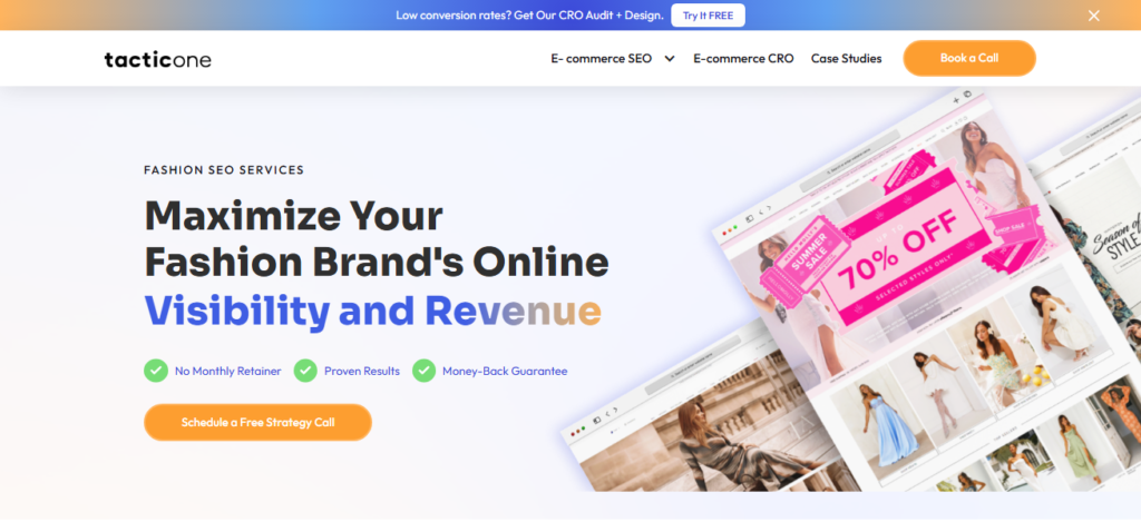 TacticOne specializes in SEO for fashion e-commerce, emphasizing strategies to maximize online visibility and revenue for direct-to-consumer (DTC) brands.