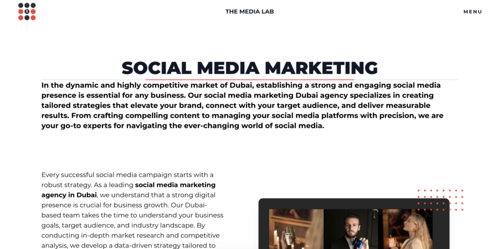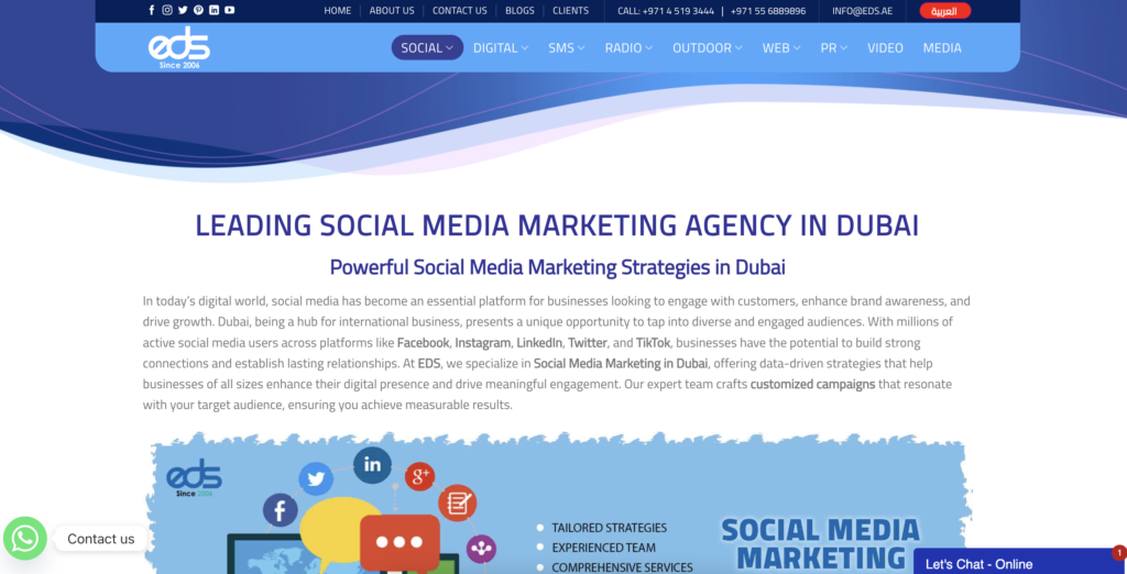 Their social media service offering spans from platform strategy to community building, paid campaigns, and content creation tailored for the UAE/MENA region.
