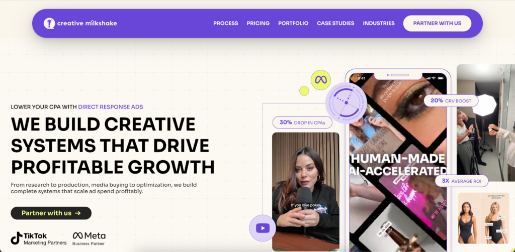 5. Creative Milkshake: Creative Milkshake specializes in performance-driven UGC, producing scalable, platform-native content for Meta, TikTok, and other paid social channels. By combining creator-led storytelling with rapid testing and optimization, they help brands improve conversion rates and scale efficiently through UGC.
