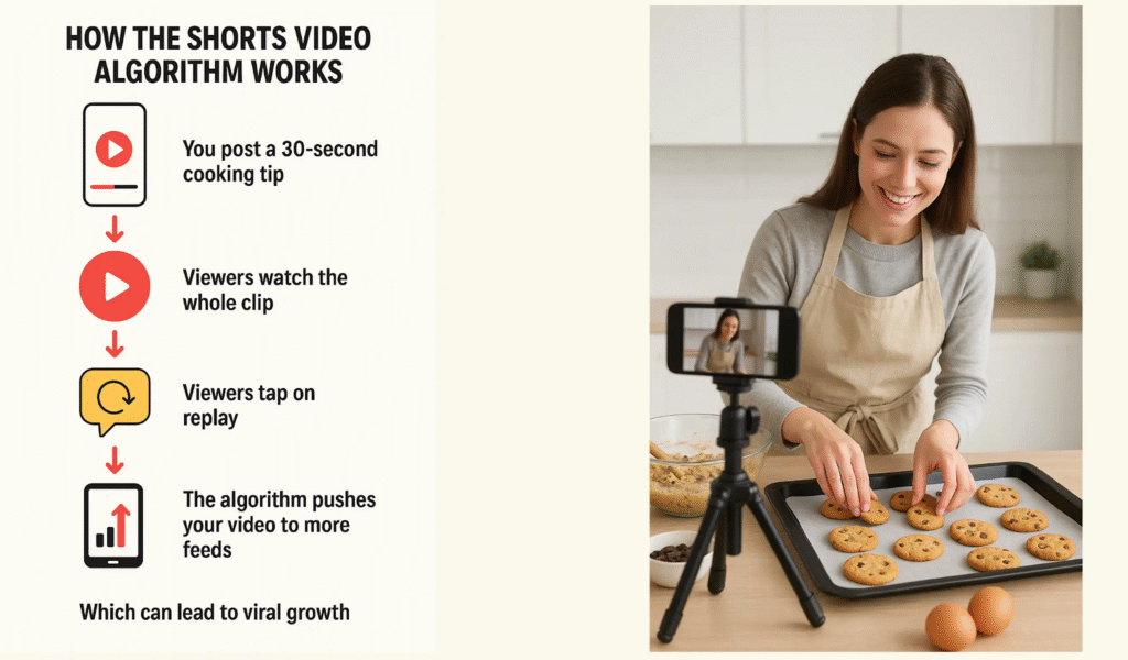 Suppose you post a 30-second cooking tip video byte. Your initial viewers watch the whole clip and tap on replay as they want to learn that secret sauce trick again; the YouTube Shorts algorithm takes it as a signal that your content is valuable. It then pushes your video to more feeds, which can lead to viral growth.