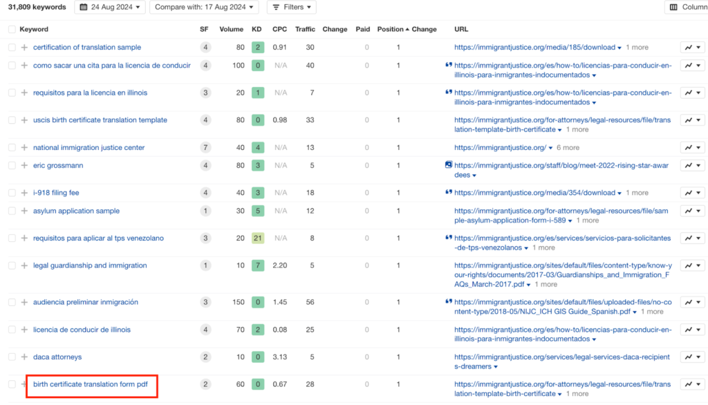 - Top keyword rankings: NIJC’s content now ranks #1 for crucial keywords, including “birth certificate translation form PDF.” This demonstrates the effectiveness of their SEO efforts in targeting the specific needs of their audience and providing valuable resources.