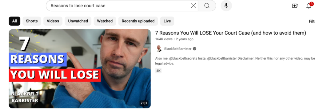 - Video content: Regularly uploading videos on YouTube that tackle common legal issues, such as “7 Reasons You Will LOSE Your Court Case,” which has garnered significant attention with over 164K views.