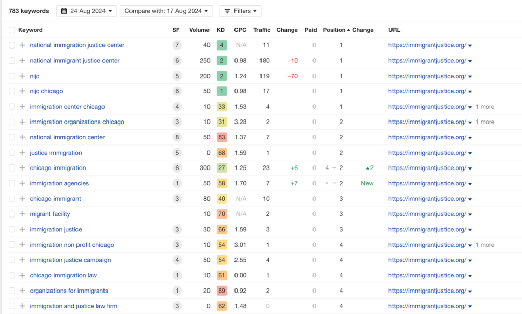 - Increased organic traffic: NIJC saw a substantial rise in organic traffic to its website. The keywords targeted in their content consistently ranked on the first page of search results, driving more visitors to their site. Their homepage, in particular, secured the #1 position for numerous high-difficulty keywords, enhancing their visibility and authority in the immigration law space.