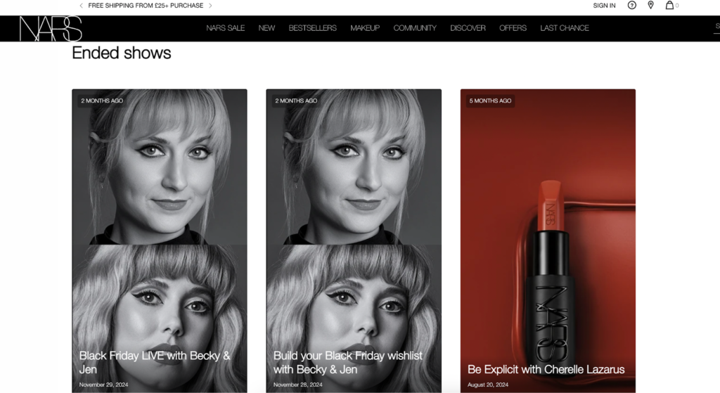 NARS Cosmetics has used live shopping sessions to show products in action while answering questions in real time. The format keeps the experience interactive while moving people toward purchase.