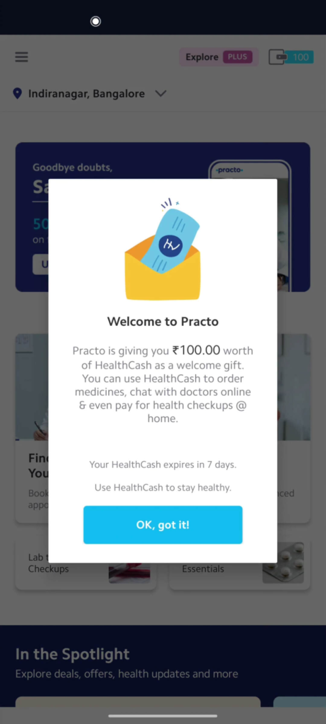 Practo, a healthcare platform in India, launched an onboarding campaign offering new users ₹100 in HealthCash to drive early engagement with its platform.