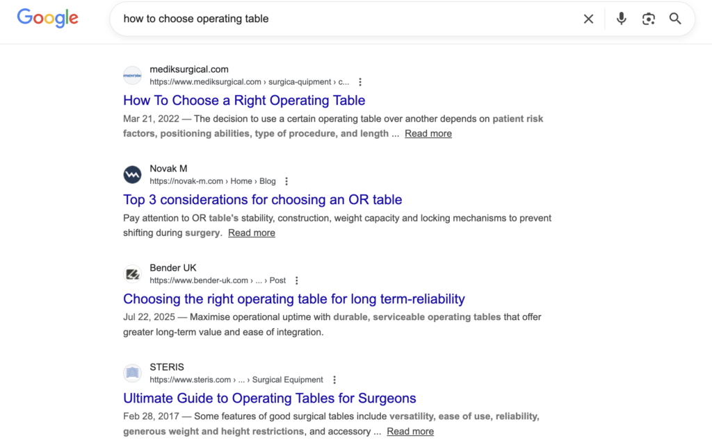 - Publish articles: Publishing thought leadership content on the market for operating tables, trends, and best practices in surgical equipment is great for the brand. It increases your trustworthiness with the target audience.