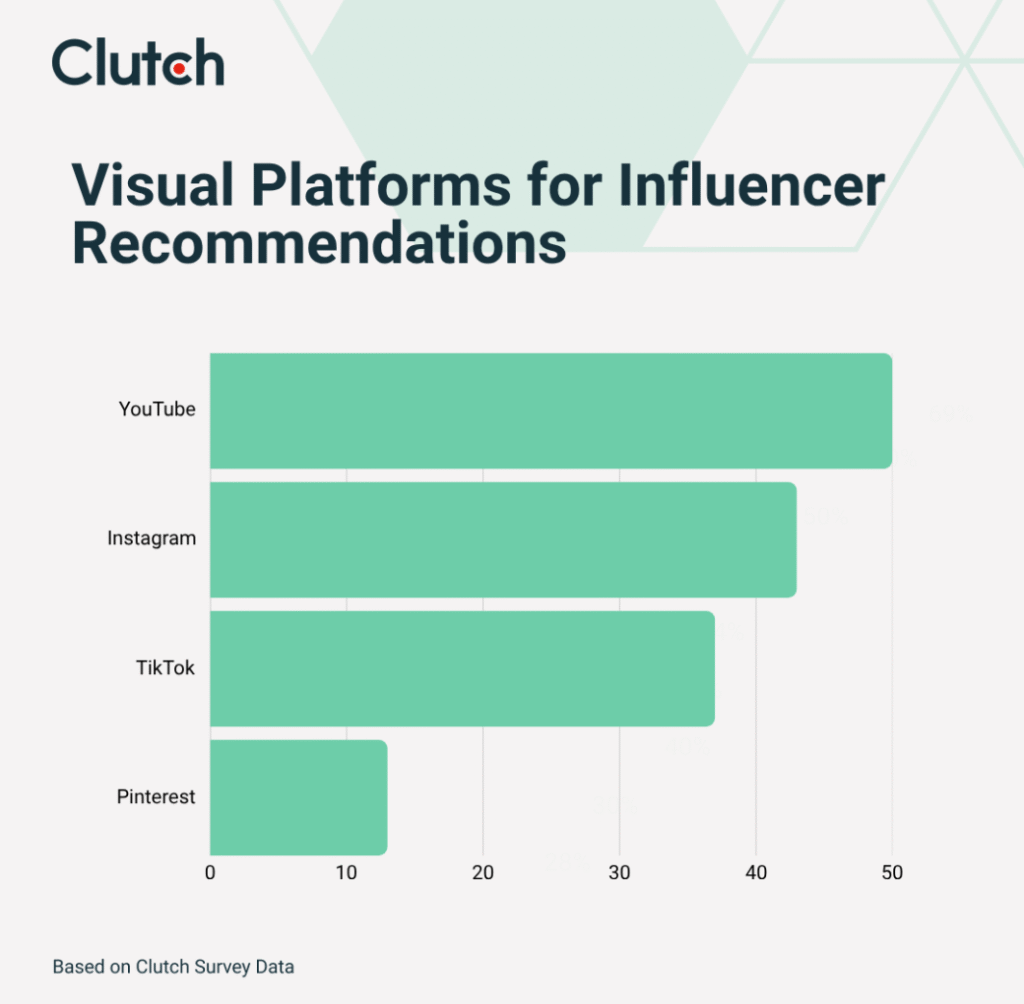 A recent study from Clutch found that nearly 61% of people discover new products through influencers on visual social platforms like TikTok, Instagram, YouTube, and Pinterest.