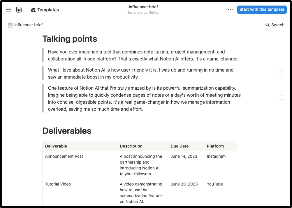 It saves everyone from messy email chains and helps them see what’s in your head without any over-explaining. Notion even offers a free template called “Influencer Brief” that you can repurpose however you like.
