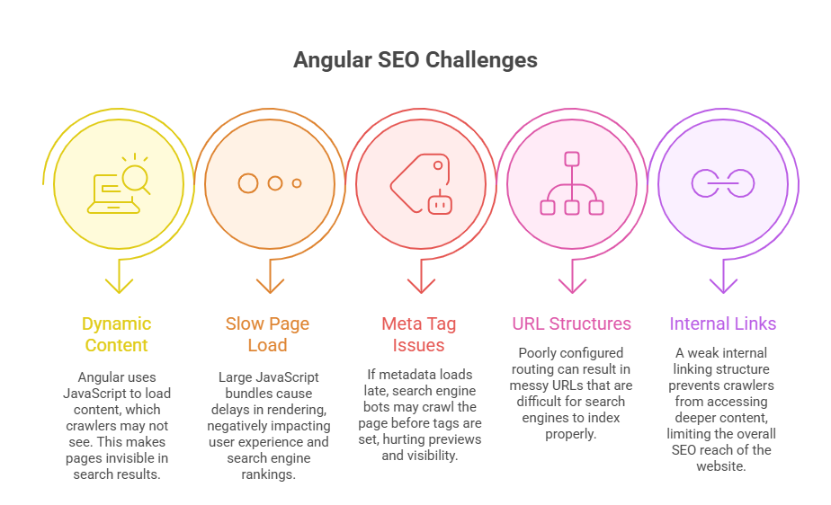 The biggest offenders: content that never shows up in source, slow initial loads, bad metadata timing, messy internal links, and weird URLs. The fix? Angular Universal, smart routing, dynamic meta services, and tools that catch issues before Google does.