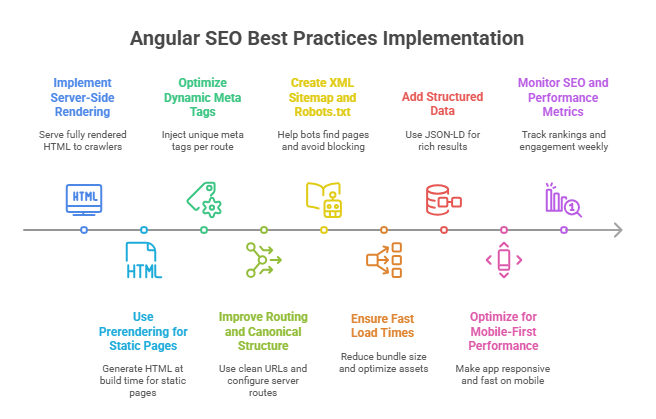 Angular’s Meta and Title services help you inject and update these programmatically. If you skip this step, you risk blank previews, duplicate snippets, or incorrect indexing.