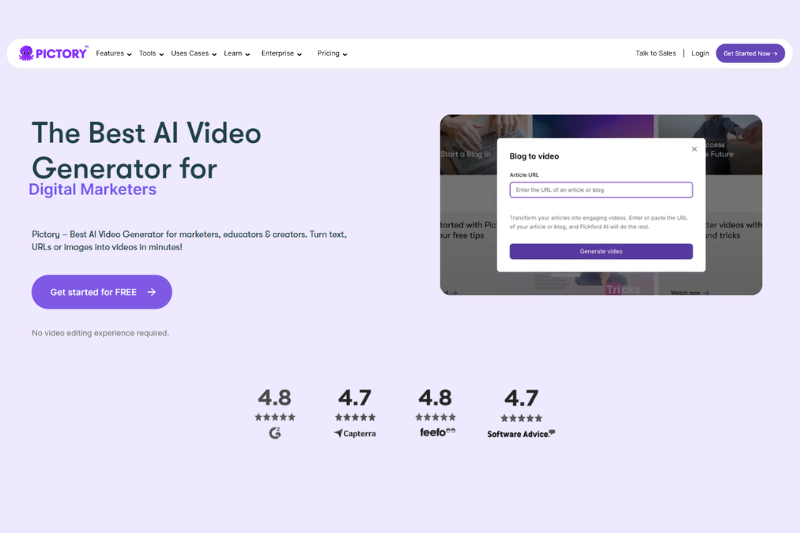 Pictory plans start at $19/month, and it’s a hit among users for ease of use and time savings. The trade-off: limited editing depth compared to full video suites like Adobe Premiere or Runway ML.